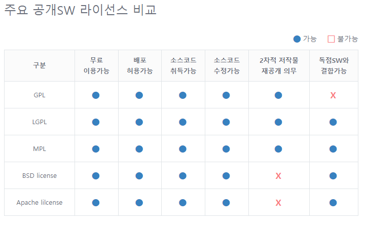 oss.kr 에 방문하시면 아래와 같이 주요 라이선스에 대한 비교표를 확인하실 수 있습니다.