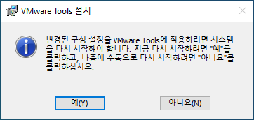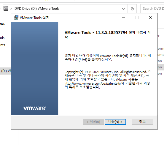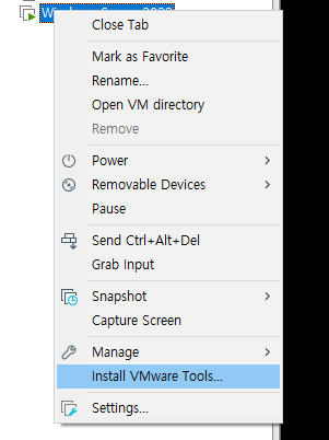 guest(vm)과 host(내 컴퓨터) 간 클립보드 전송과 vm 화면 최적화(확대)를 위해 VMware Tools 설치가 필요합니다.