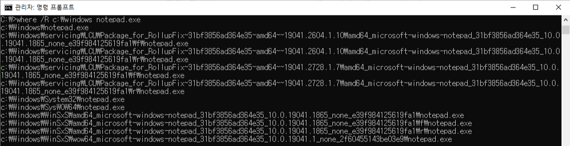 윈도우 색인 기능으로 파일은 왜이리 안찾아질까? 그래서 사용하는게 listary나 클로버 같은 프로그램들인데 이런 프로그램을 사용하지 못하는 경우도 있다. 구버전 서버라던가 회사에서 라이선스가 없어서 사용 못한다던가.. dir 명령어의 /S 옵션으로 파일을 찾을 수 있습니다. 파일 찾기 dir /s notepad.exe 라고 치면 현재 경로에서 notepad.exe 를 찾습니다. dir /s *.exe 하위 exe 확장자를 모두 찾습니다. 만약 루트 디렉토리 즉, 드라이브 전체에서 찾고 싶다면 앞에 \를 붙여주면됩니다. dir /s \*.exe 그럼 드라이브 전체를 검색합니다. 디렉토리만 검색하려면 아래처럼 명령어를 입력합니다. dir /s /a:d \microsoft* 이러면 드라이브에서 microso..